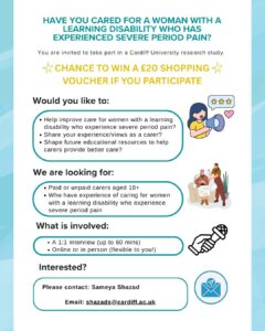 Sameya is looking to talk to parents/carers/support workers who have experience of caring for women with a learning disability who experience severe period pain.