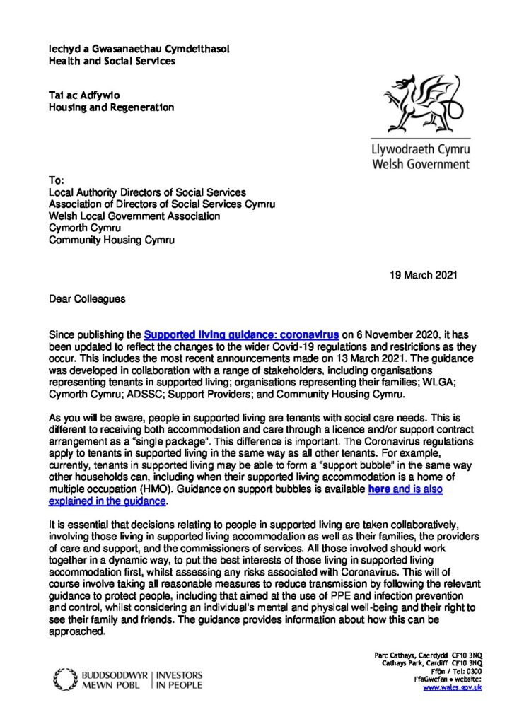 The Welsh Government has updated the supported living guidance: coronavirus.