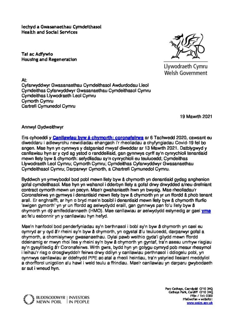 From the 13th March 2021 it is possible for tenants and families to meet up outdoors for walks or in private gardens – but no more than four adults from two different households, as is the case for everyone in Wales.